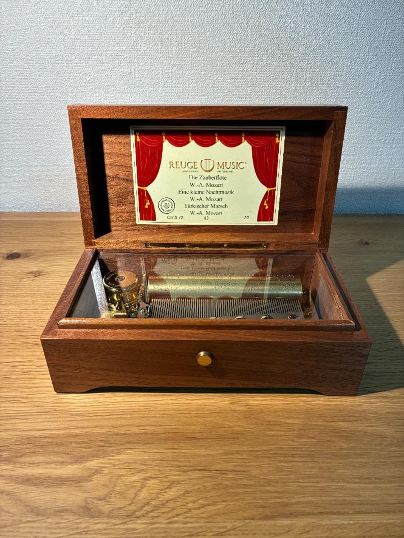35年前くらいにドイツ留学中、スイス旅行の時280,000円で購入したスイス製オルゴールです!圧倒的な存在感です曲目はラフマニノフ ピアノ協奏曲第2番 全三楽章の有名なフレーズをピックアップしてあります。重厚さといい、音質といい、反響といい…文句のつけようがありません!異空間へといざなってくれる魔法の音色の様ですインテリアとしてもクラシカルな雰囲気もあり、透明度の高い全方向ガラス張りは、職人のプライド、自信作を物語っています!どの方向からも眼を凝らして見てくれ!っとドヤ顔の職人さんには圧倒されます!サイズは下記の通り120(縦)x200(横)x70(高さ)mm。新品72弁アニメ「青のオーケストラ」♪CA~(3P)オルゴール720オルフェウスレビュー
